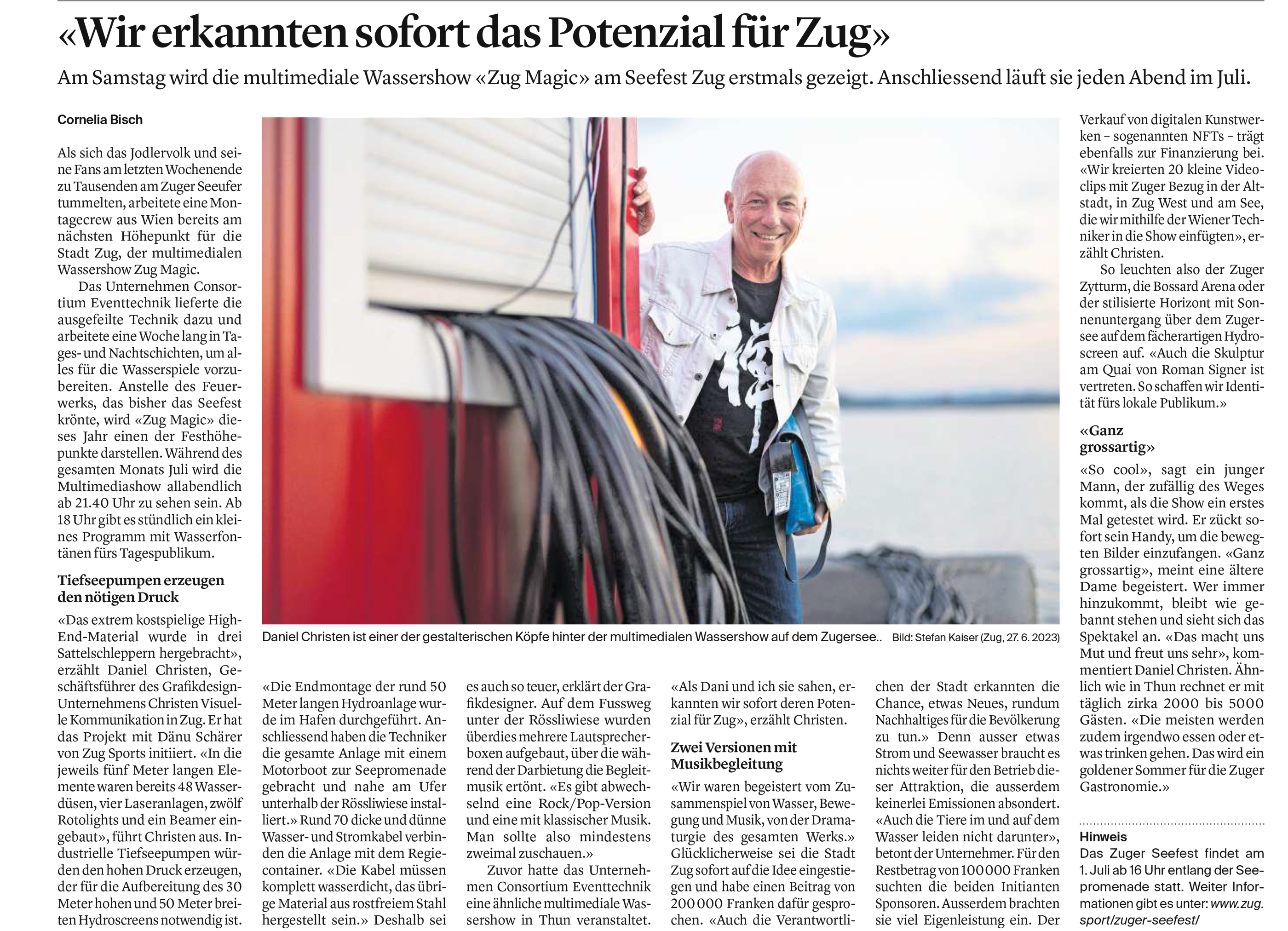 ZugMagic - that is the name of the water show that Daniel Christen and Dänu Schärer launched in the Zug Lake in 2023. In 2023, we developed a water show with views of Zug. In 2024, we developed a show with our landmark, the Zytturm: It has been ticking for centuries and sets the pace for the surroundings - TikTak, TikTak, TikTak! With the multimedia staging, we take up the themes of the Zytturm and create a unique water spectacle: How the tower was built, how it was threatened by foreign powers and fire, and how it was seduced by lovers. We created a fascinating journey through time with classical music, water, light, lasers and video: From the Big Bang to the future - with ticking clockworks, zodiac signs, clouds of fire and floating celestial beings.